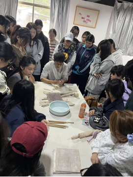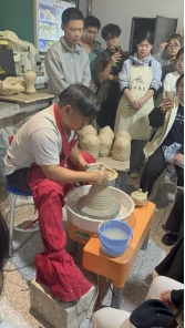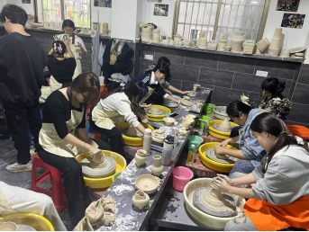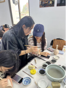 10月22日至25日,拉坯、泥塑、釉下五彩绘制等基础课程循序渐进,同学们从生疏到熟练,在泥土与色彩的碰撞中感知陶瓷创作的独特魅力;26日的釉下青花绘制课程中,每人完成杯子、碗、小盘子、小花瓶四件作品,将创意融入传统工艺。