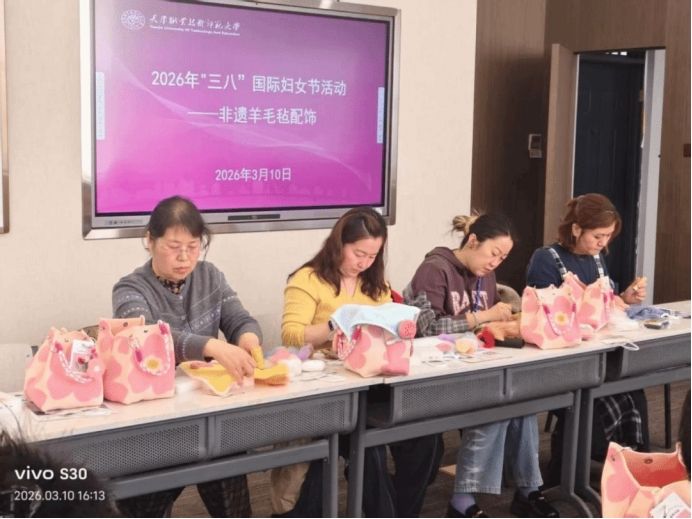 在非遗宋锦手工包制作现场,女教职工们化身“巧手匠人”,认真聆听指导老师的讲解,穿针引线、精心裁剪,一块块蕴含非遗底蕴的宋锦布料,在指尖渐渐蜕变为端庄大气、灵动精巧的中式手工包,每一件作品都凝聚着大家的巧思与热爱,充分展现了女教职工们心灵手巧、热爱生活的良好风貌。锡纸画创作现场氛围温馨而热烈,大家全神贯注、匠心独运,或凝神雕琢、追求细节极致,或轻声交流、分享创作灵感,将创意与美感融入作品,在舒缓的氛围中卸下工作疲惫,收获了内心的宁静与创作的喜悦。非遗羊毛毡配饰制作以“指尖非遗绽芳华”为主题,将非遗传承与节日祝福深度融合,在指导老师细致讲解下,女教职工们在实操体验中感受传统工艺的独特魅力,共话匠心、共赴美好。